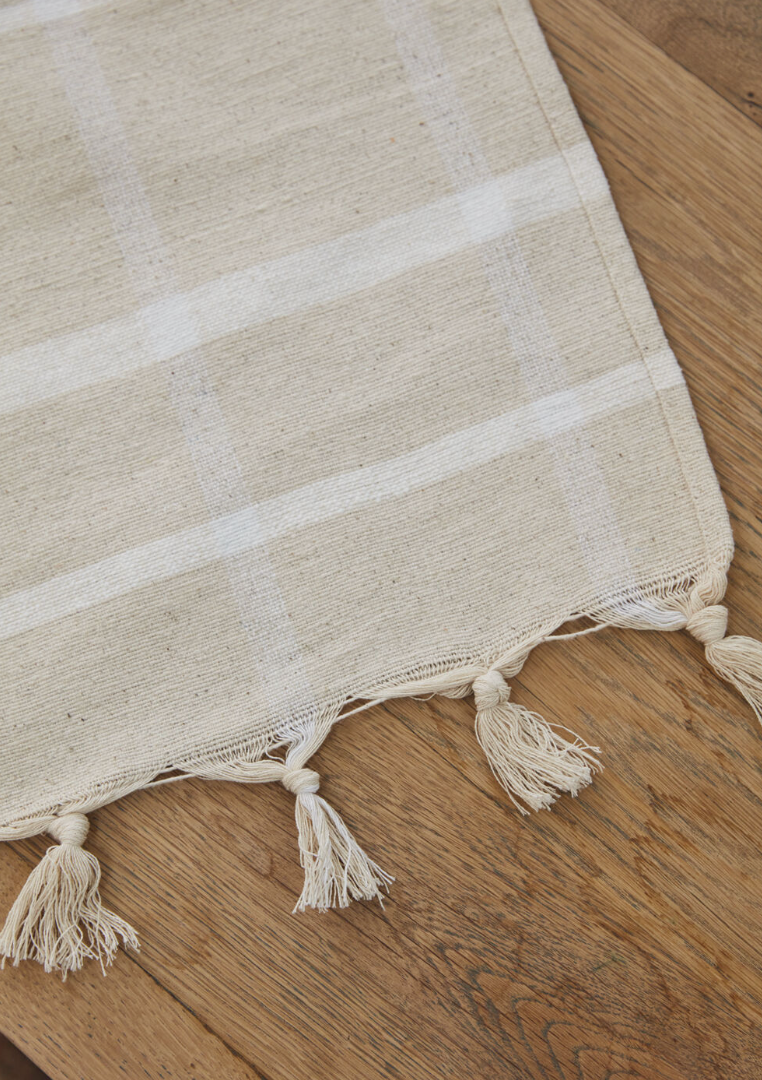 Give your table settings a rustic cottage feel with the woven cotton Camino Table Runner. Featuring a cream & white grid pattern with tassels on either end, this runner is a warm, neutral base for table decor. Pair with the white or brown Camino Placemat for a coordinated interior design look.