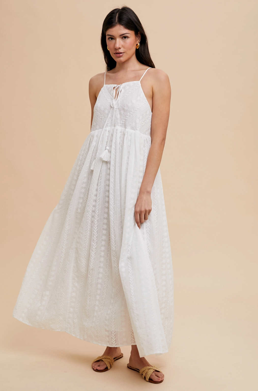 SLEEVELESS MAXI DRESS FEATURES TONE AND TONE ALL OVER EMBROIDERED COTTON FABRICATION WITH TASSELED SELF TIE, ADJUSTABLE STRAPS, AND FULL RAYON LINING.