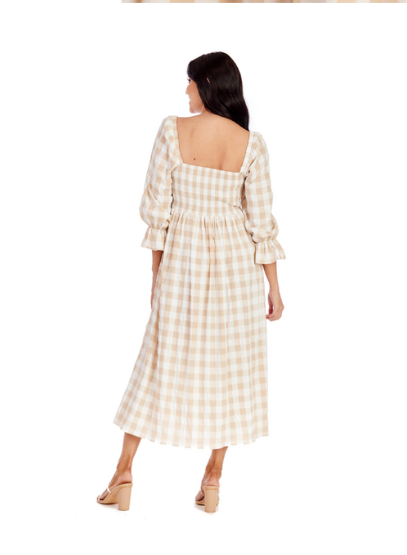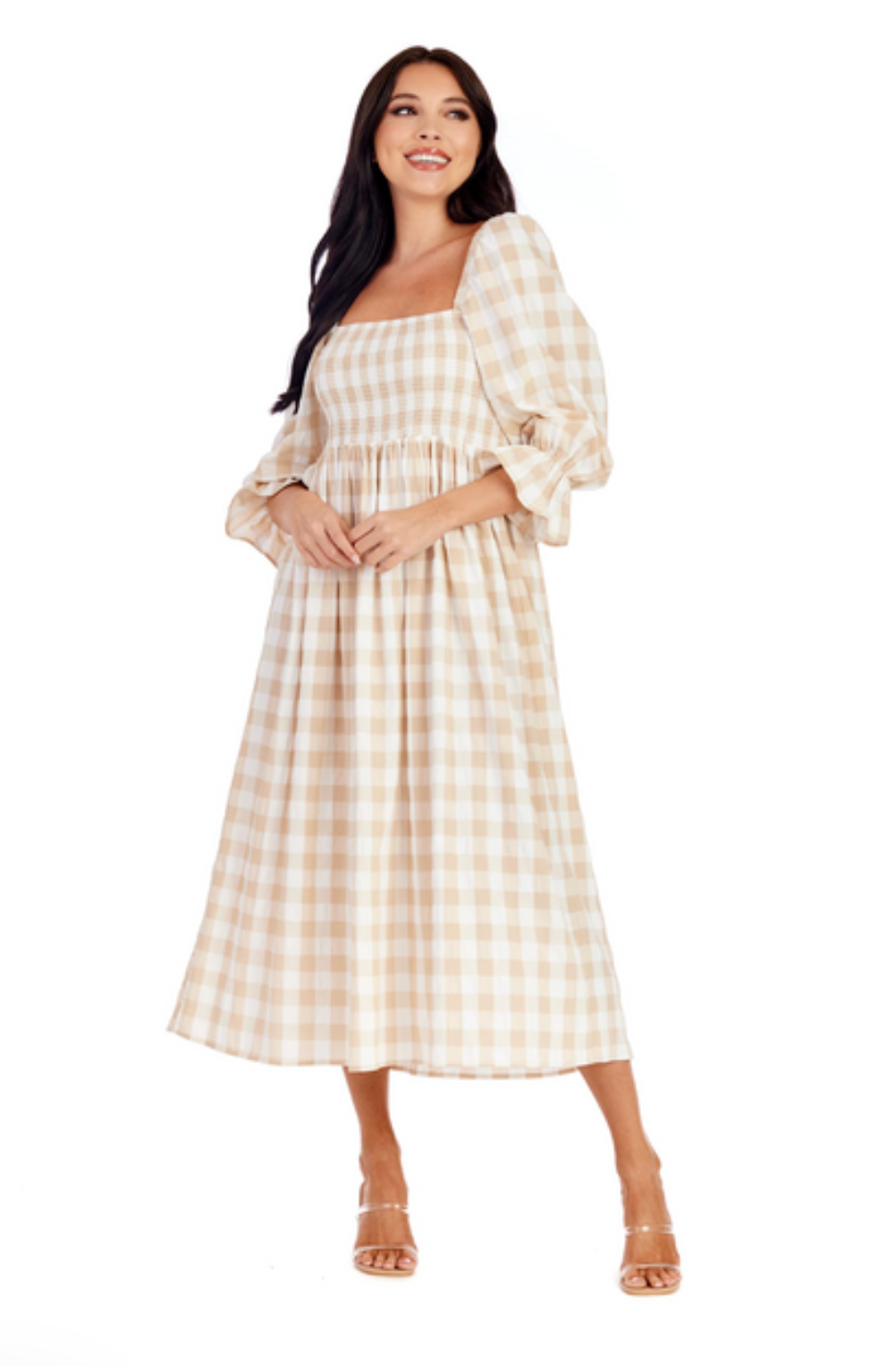 The Byerly Plaid Midi Dress offers women a stylish and comfortable choice. Crafted from a poly blend fabric, this dress showcases a timeless gingham pattern. The smocked chest adds a flattering and feminine touch, while the 3/4 sleeves with ruffle detail bring a playful and trendy vibe. With a length of approximately 48" from shoulder to hem, this midi dress is suitable for any occasion. It is easy to maintain, as it can be machine washed cold separately. For best results, use the gentle cycle and only non-chlorine bleach when necessary. Tumble dry low and cool iron if needed. The dress is made of 98% polyester and 2% spandex, ensuring a comfortable and stretchy fit.