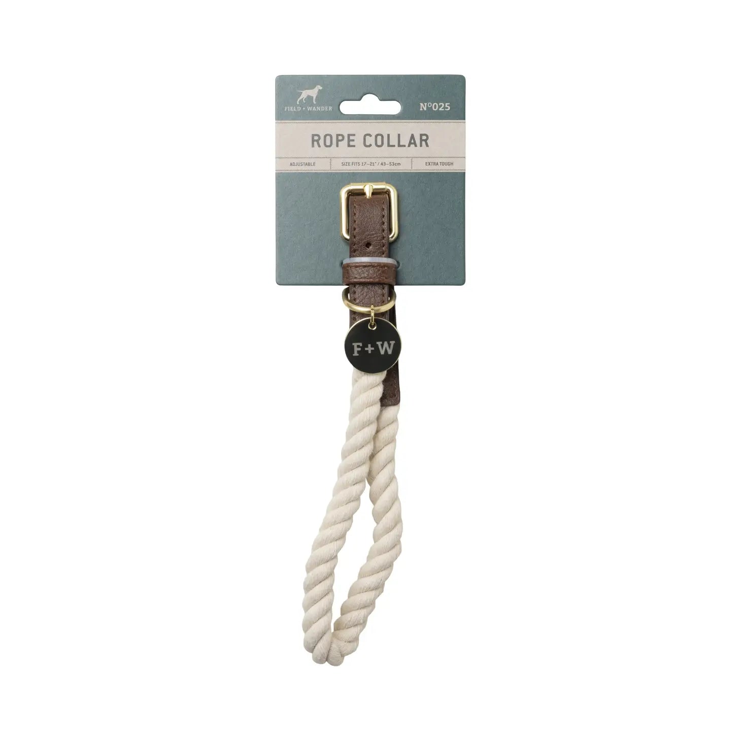 Perfect for your next adventure, our adjustable Rope Collar is 15mm thick. Natural with brown PU. Brass finish hardware with engraved dog tag and attachment ring. Large collar: 23.6”w x .78”h / adjustable 17-21”
