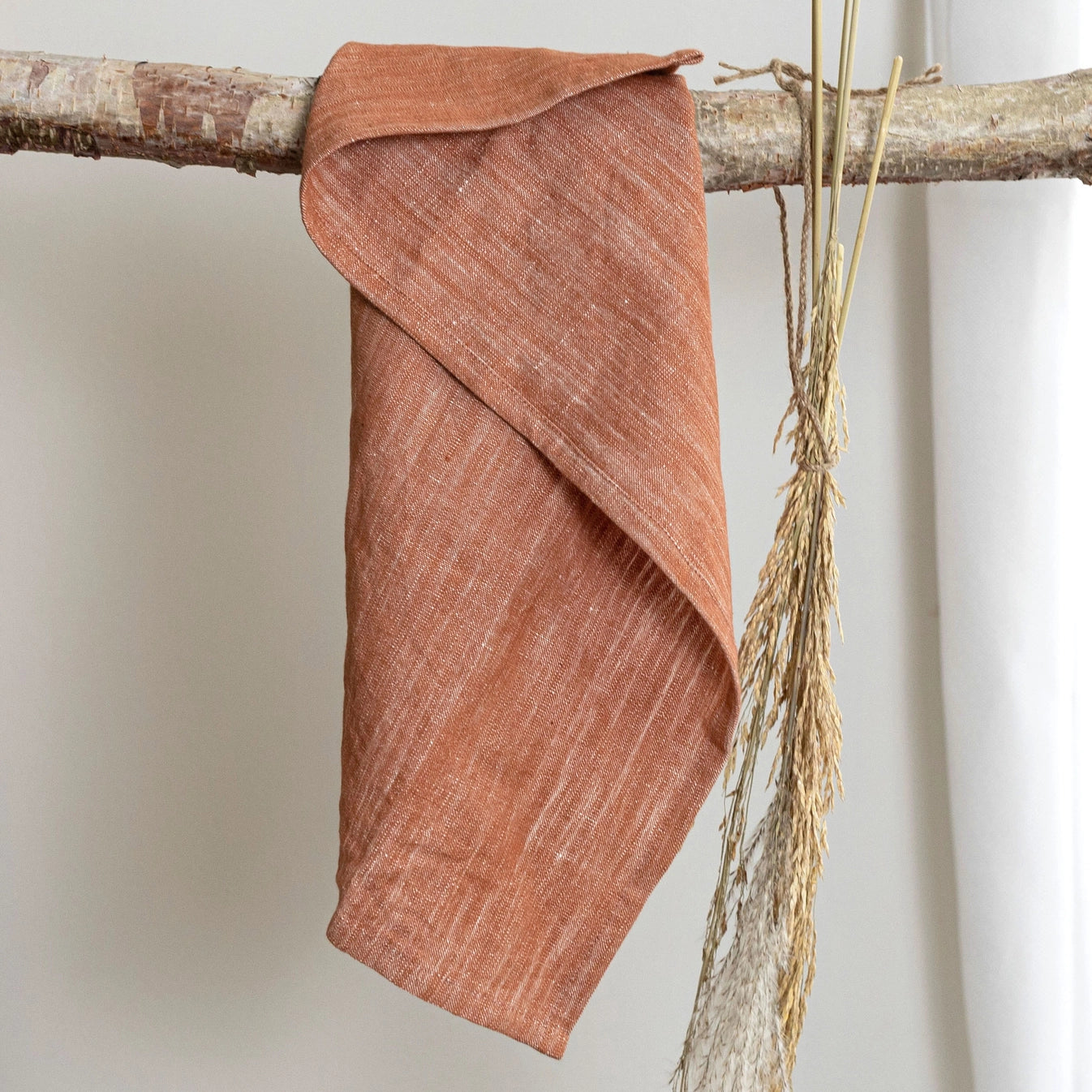 Accent your kitchen with this lovely linen blend tea towel. Traditional in style, the bold red rust color adds a lively warmth. This super soft kitchen towel features a two-tone woven base with unbleached cotton to soften the terracotta color. A towel that is as beautiful as it is functional. -Both decorative and functional dish towel use. -Machine wash separately in cold water. Line dry. Do Not Bleach. Warm Iron If Necessary. -Pairs perfectly with traditional style kitchen decor. -Dimensions: 27 x 18 x 0.25"H -Material: Cotton & Linen -Soft woven linen blend in warm, earthy rust color.