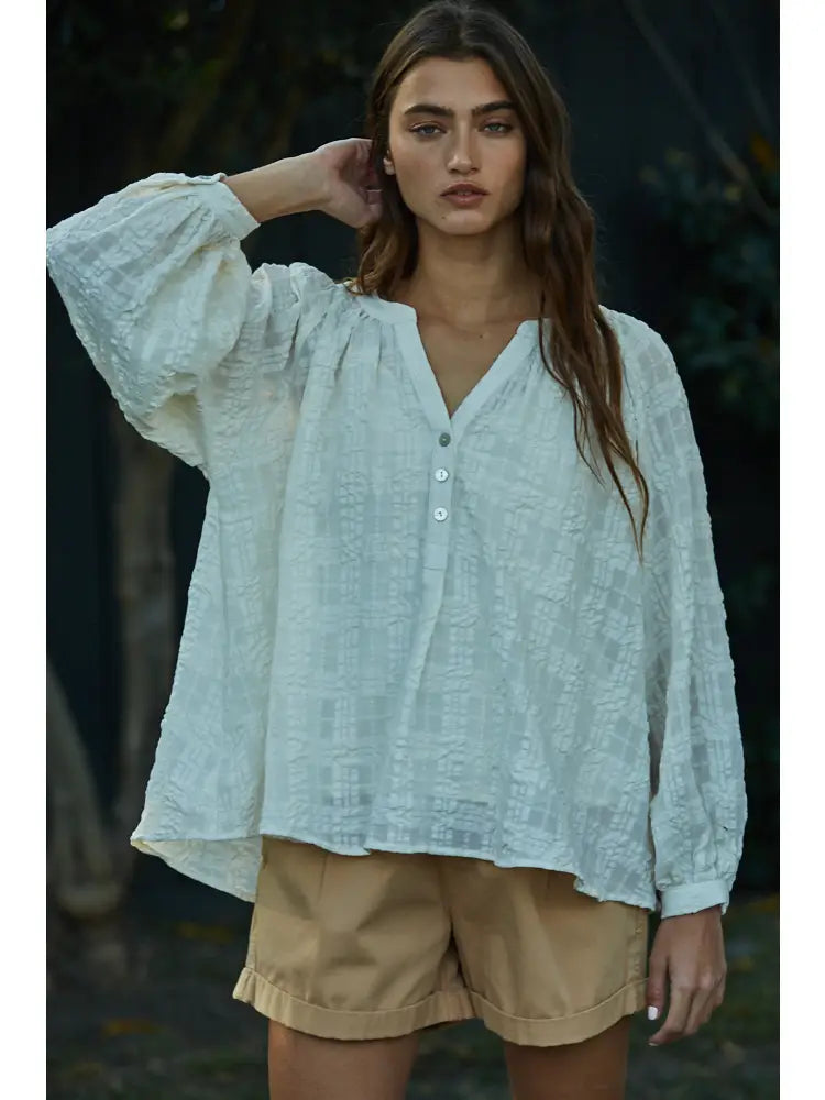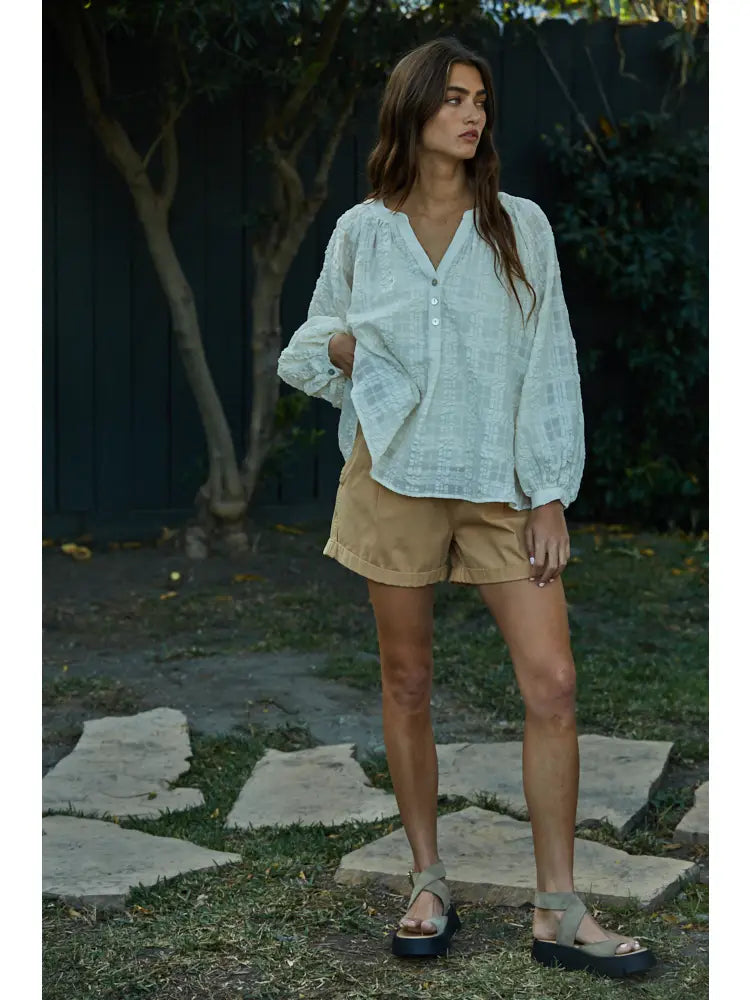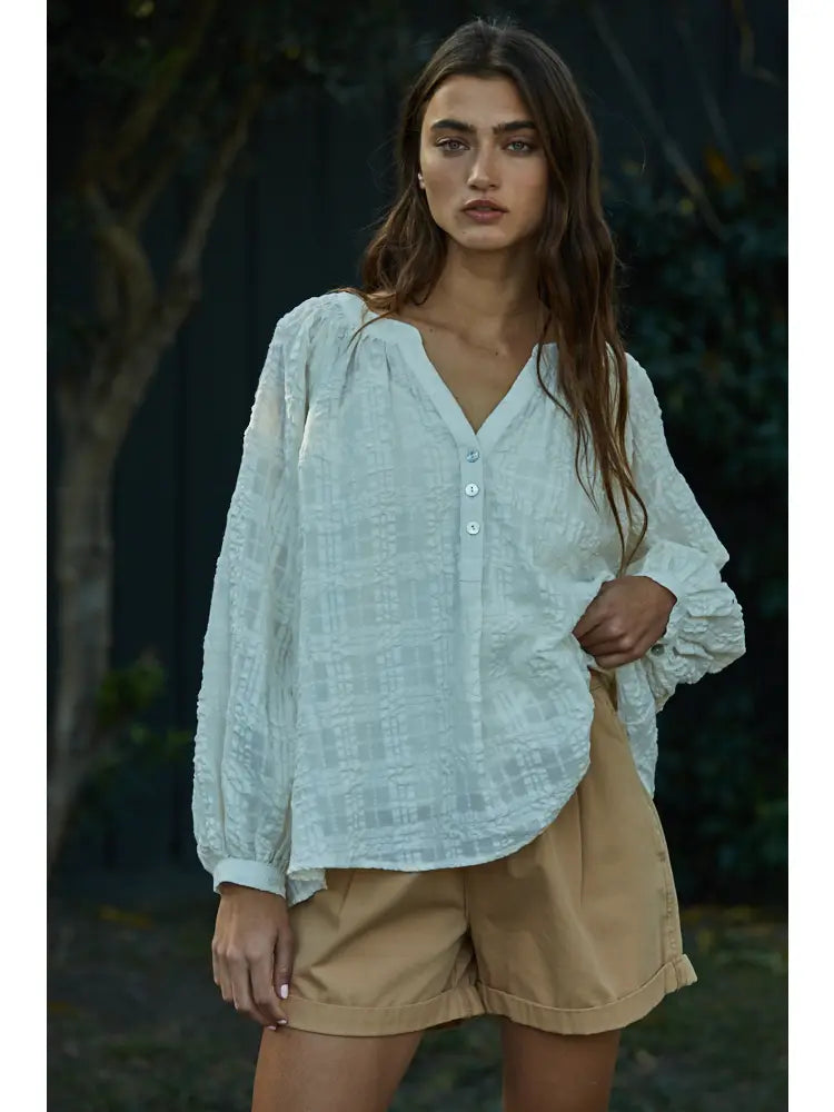 IZZIE TOP- Woven Cotton Polyester Rayon Gauze V-Neck Long Sleeve Pullover Top With Cami Lining