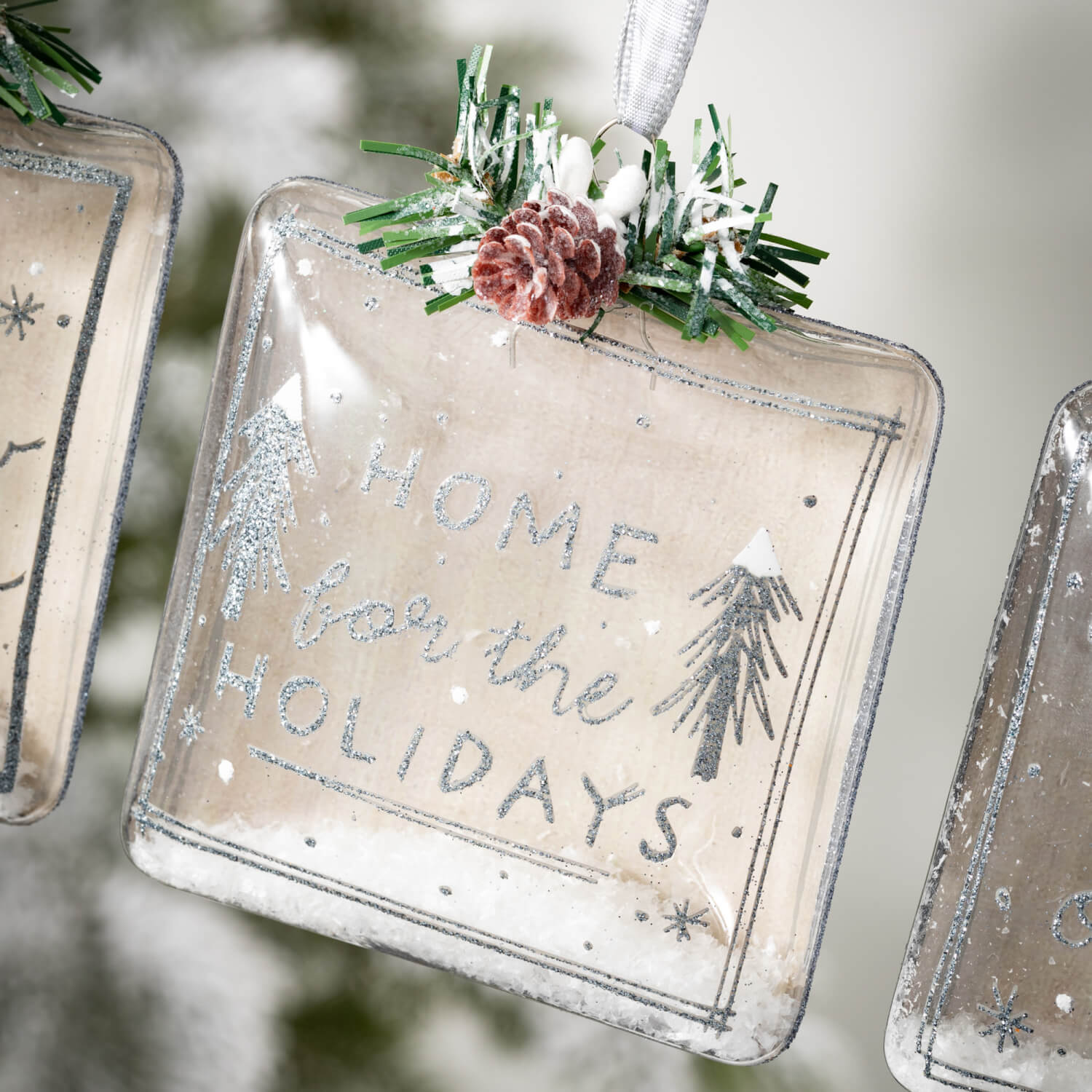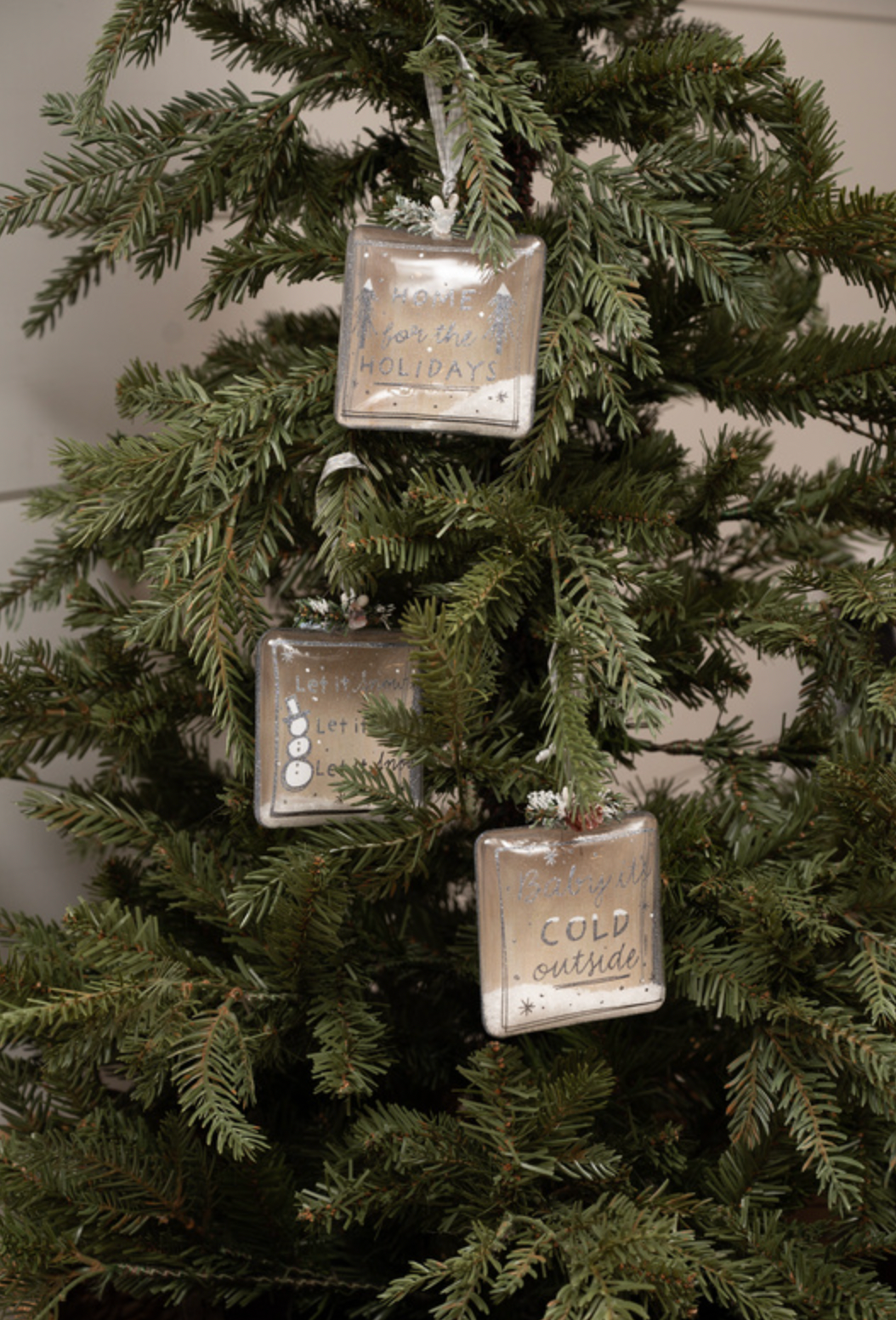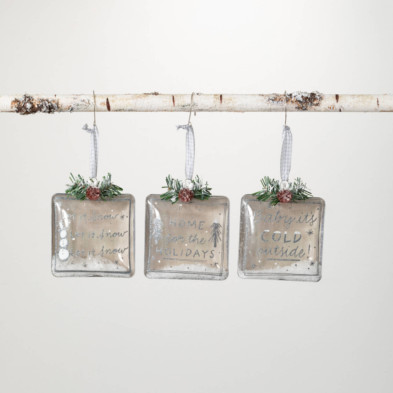 These dimensional square ornaments with rounded corners feature a dusting of faux snow encased inside. Topped with frosted evergreen and pinecones, each piece features it's own seasonal saying imprinted on the front.