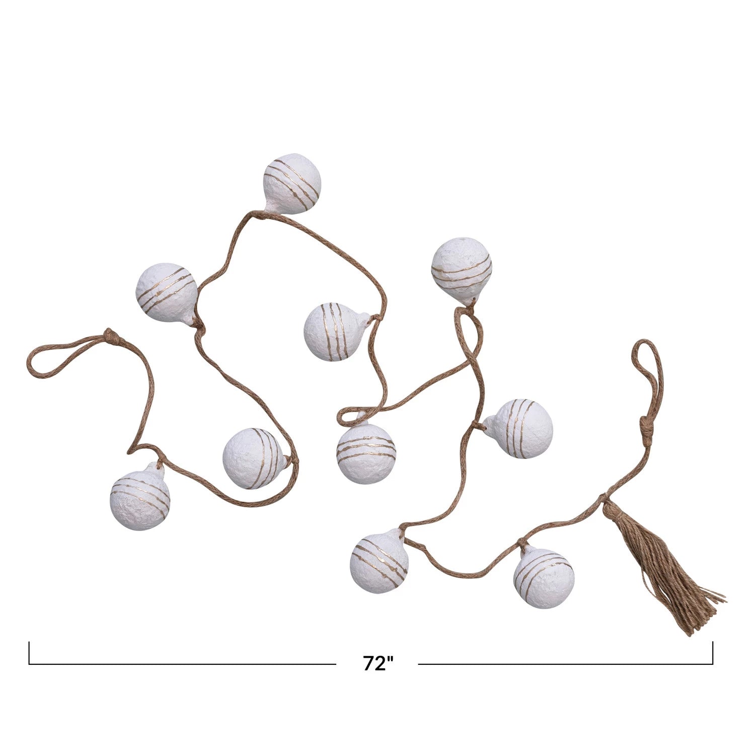 72"L Hand-Painted Recycled Paper Mache Ball Garland w/ Gold Foil & Tassel in Kraft Box, White