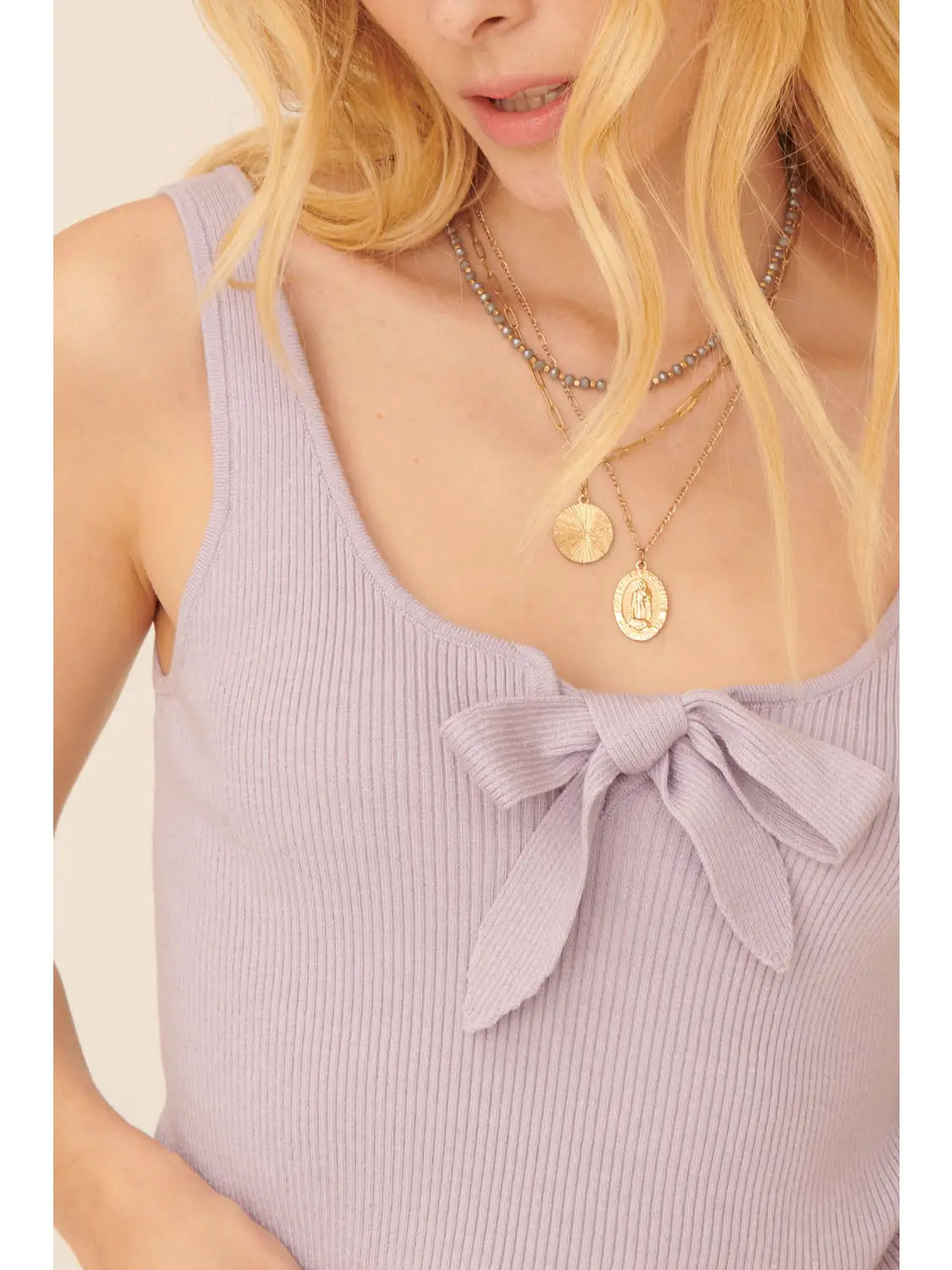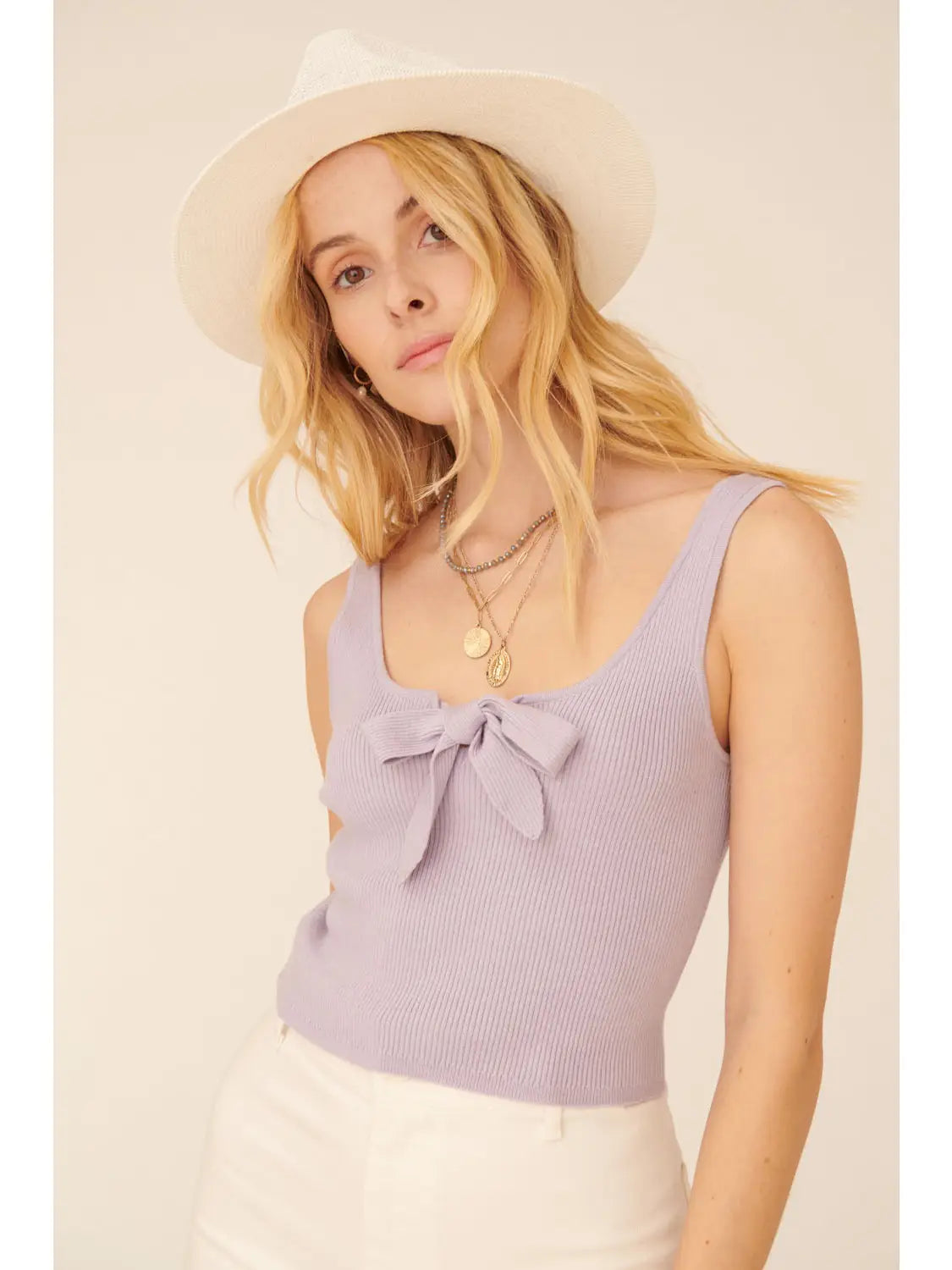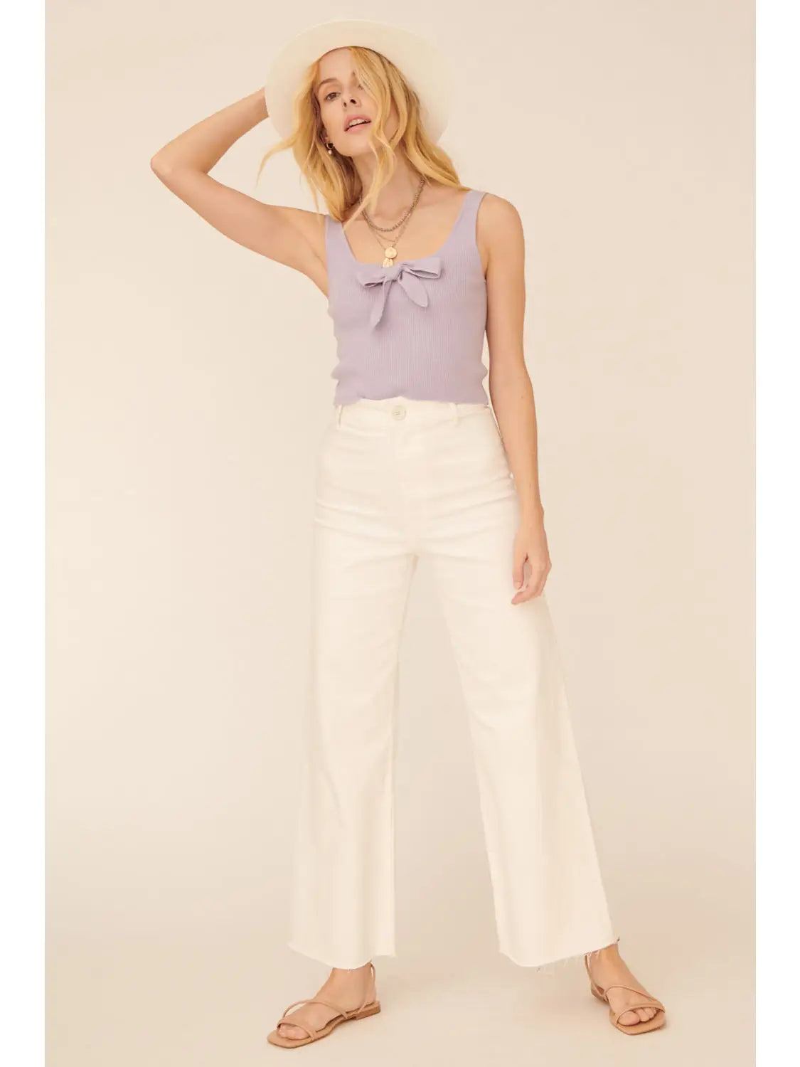 A solid, knit sweater top with the following features: Scoop neckline. Tank shoulder straps. Sleeveless. Bow front detail. Flower shaped buttons. Low square back. Fitted silhouette. Model Info: Height: 5 ft 9 in | Bust: 32 in | Waist: 25 in | Hips: 34 in | Wearing Size S.