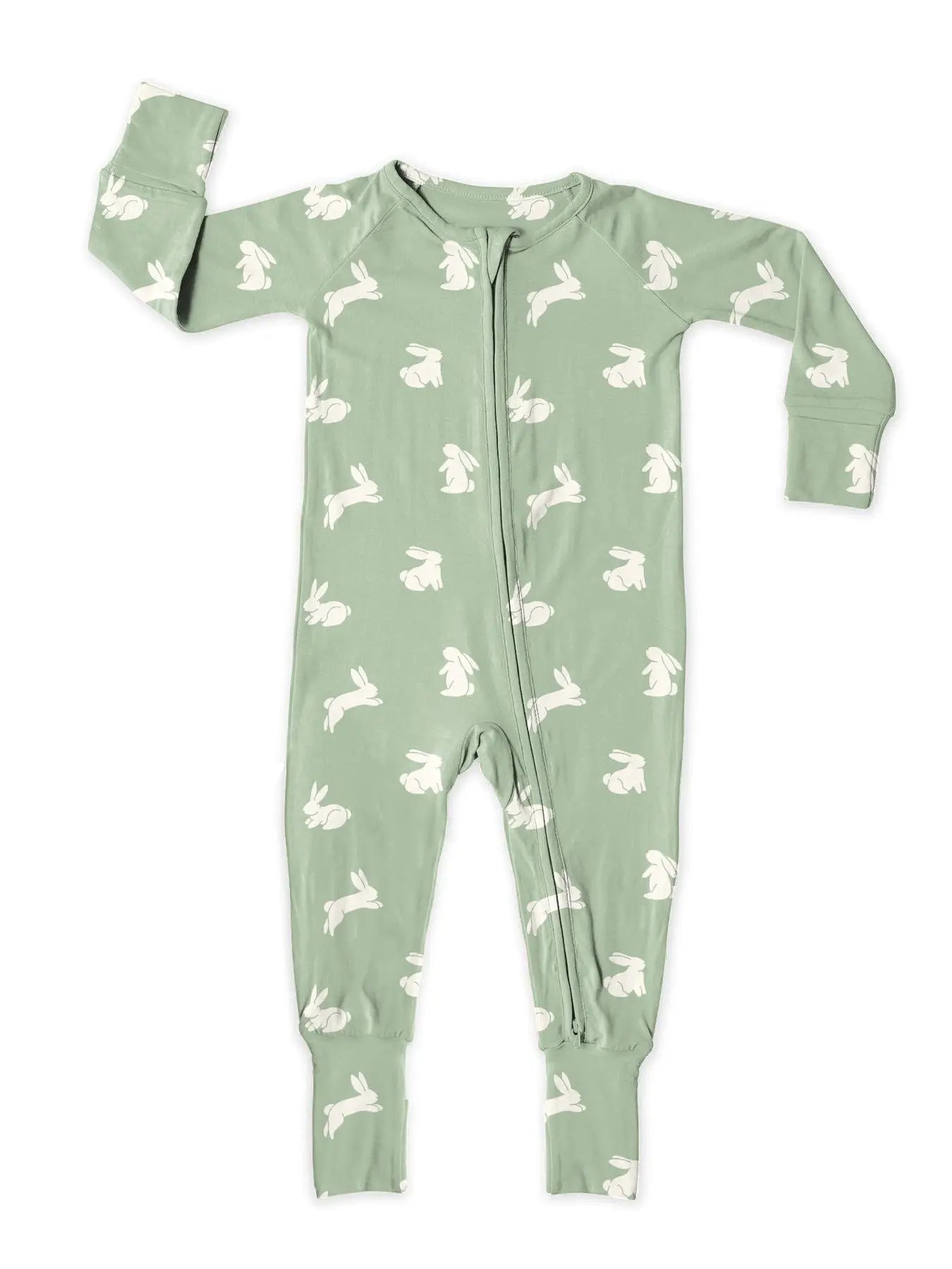 Spring Bunnies Zip-Up Bamboo Pajamas | By Sweet P Baby Co. Made of 95% bamboo cotton and 5% spandex are buttery soft, breathable & oh so cozy. * Fold over hands and feet and added length, allowing your baby 3x as long * Two way zipper for easy diaper changes * Soft breathable material * These are designed to fit your children for a long time due to the nature of the fabric and run slightly big. We suggest sizing down if in between sizes. *care instructions - wash with like colors on cold, tumble dry on low or hang dry for added longevity, zip before washing, do NOT bleach