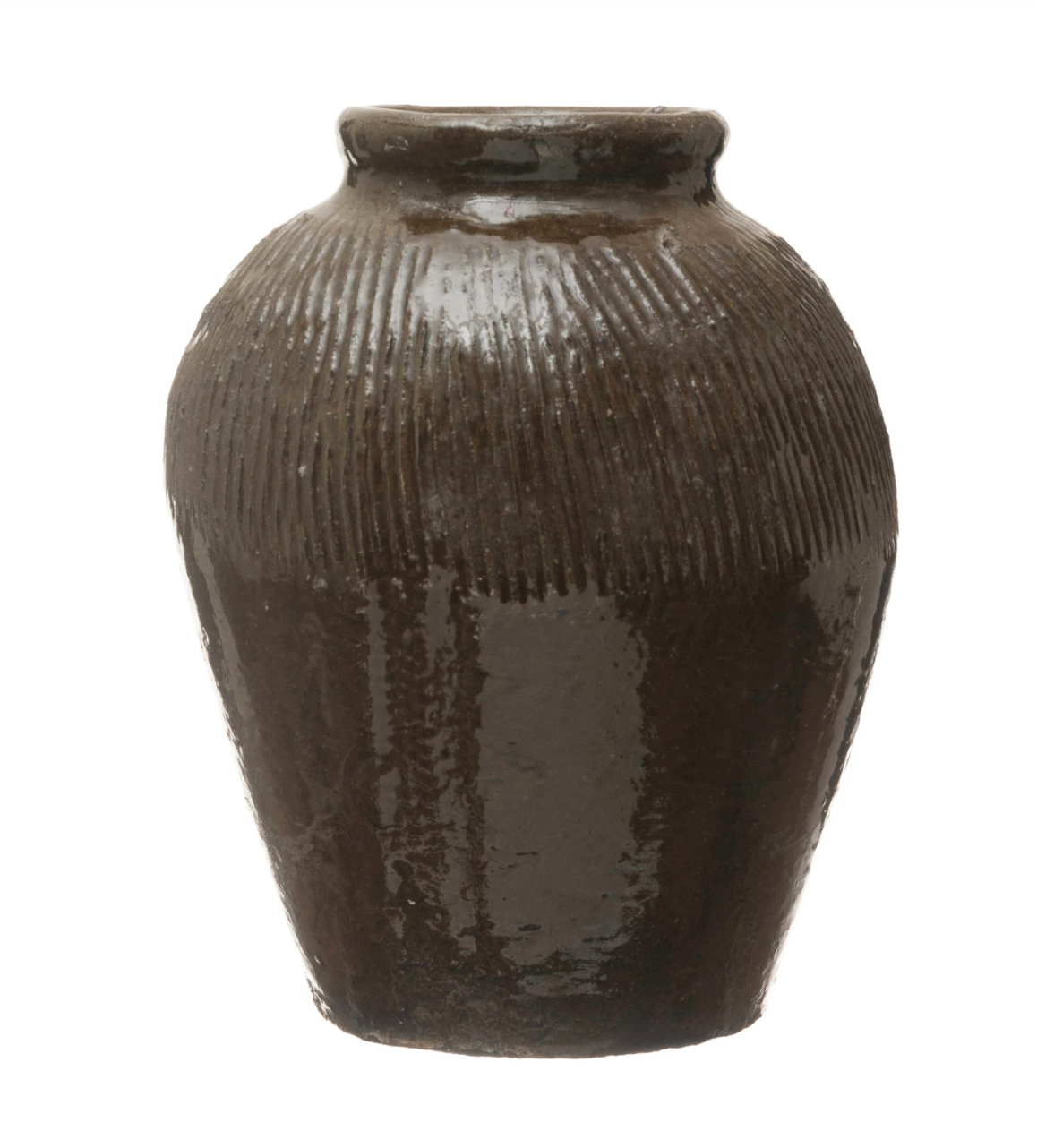 Approximately 7" Round x 8-1/2"H Found Decorative Textured Clay Jar, Reactive Glaze, Brown (Each One Will Vary)