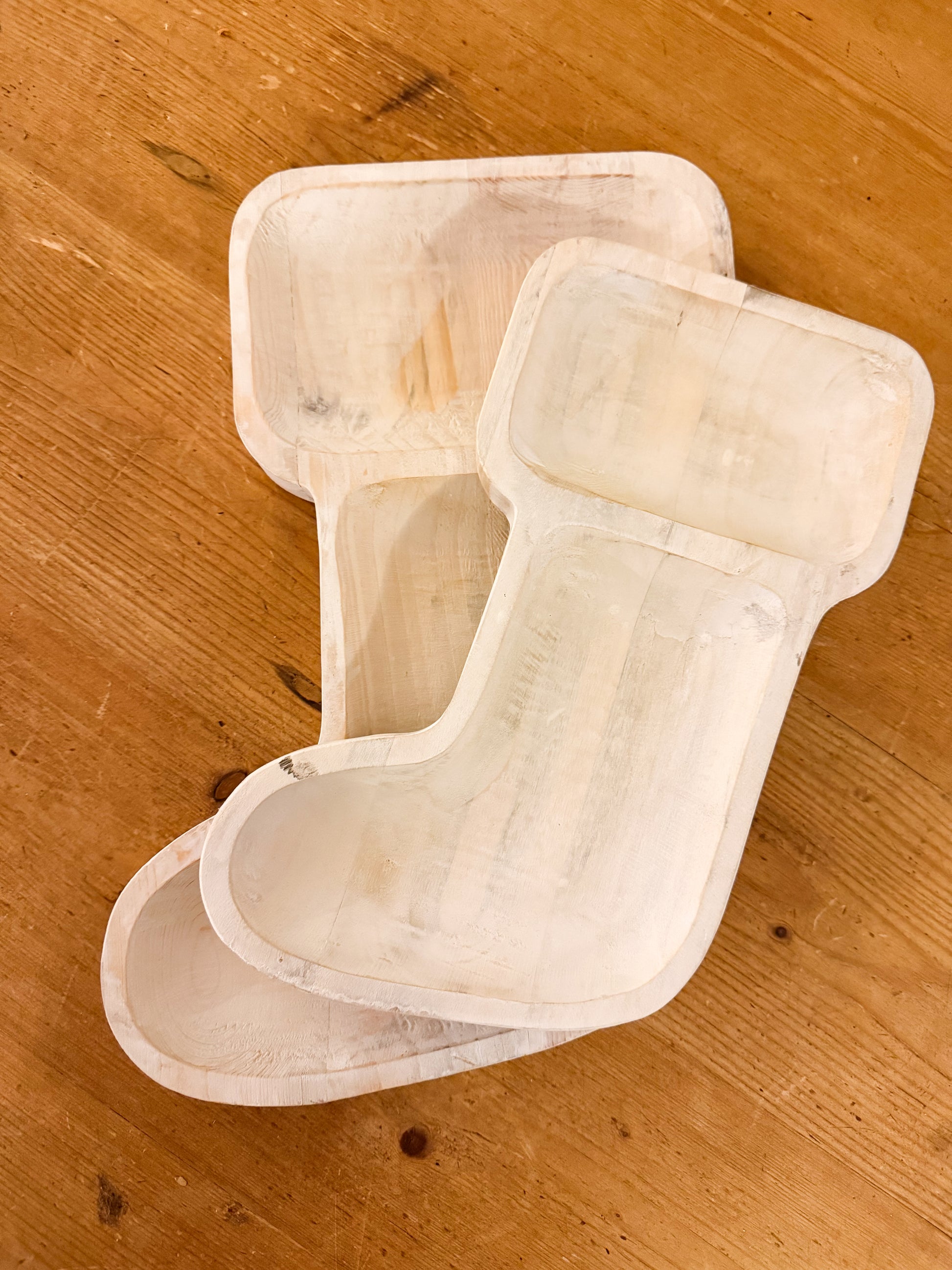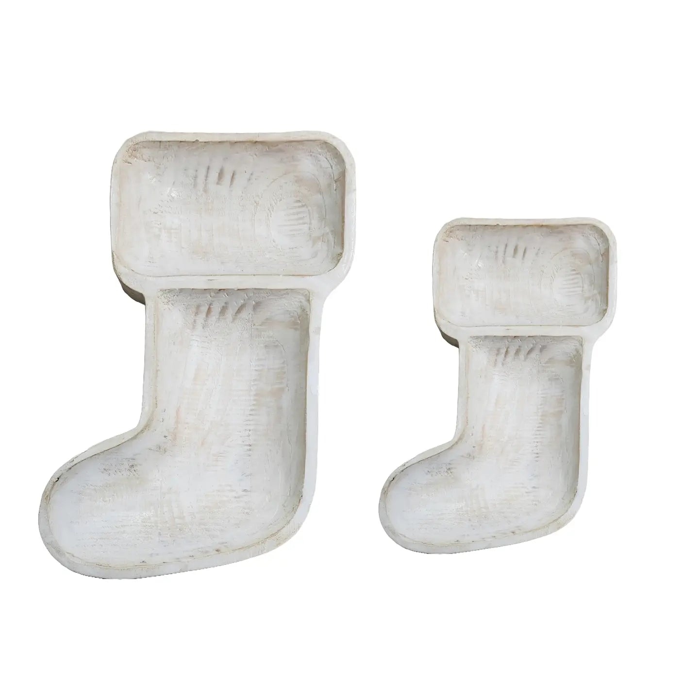 Celebrate the season with these handcrafted stocking-shaped bowls made from reclaimed wood. Whitewashed for a rustic holiday charm, they’re perfect for serving treats or displaying festive decor. Available in two sizes to suit your holiday needs.