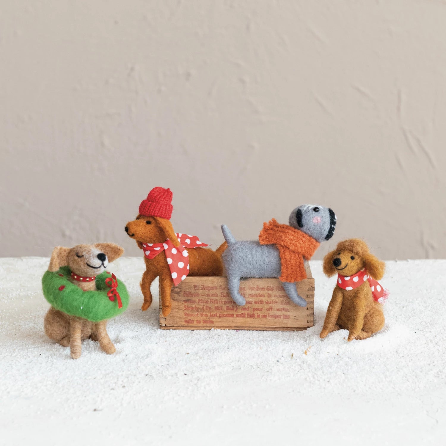 wool felt Christmas dog with multicolor and four different styles is a cute and colorful item that will make the holiday decor more cheerful and lively. Christmas dogs are made of polyester and wool, a soft and cozy material that gives them a fluffy and warm feel. Each Christmas dog has a different breed, such as a pug, a poodle, or a dog with a knit hat or a wreath, that adds some personality and variety to the Christmas dog collection. These Christmas dogs are adorable and fun for decorating the home, office, or car, and they suit any festive mood or theme. This set of four wool felt Christmas dog with multicolor and four different styles is a cute and colorful item that will make the holiday decor more cheerful and lively. Add some cuteness and color to the holiday decor with this set of four wool felt Christmas dog that feature multicolor and four different styles. These Christmas dogs are adorable and fun for decorating the home, office, or car, and they suit any festive mood or theme. Each Christmas dog has a different breed, such as a pug, a poodle, or a dog with a knit hat or a wreath, that adds some personality and variety to the Christmas dog collection.